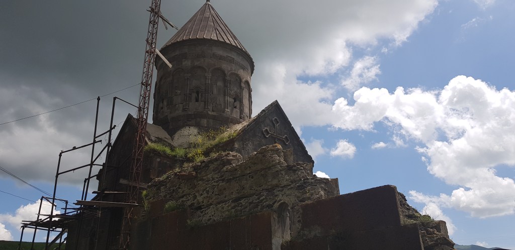 We then went to the bakery where they have these huge ovens in the ground. There is a video of a man sticking his head in it to place the bread on the walls. To be honest, I think he was just showing off because when we were there they had long rods to do that. There is always one class clown wherever you go! After we got our lunch we made our way to a hidden church which was supported by hundreds of splintered wooden scaffolding poles. Dodgy workmanship right there. The view was astonishing and as a storm thundered on, we ate our masses of bread underneath a wooden shelter. The hidden places in Armenia are so, so beautiful. Have a little look-see at the pictures from our Aparan adventure.